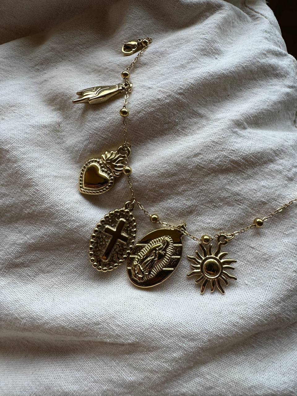 Composto da una sottile catena in acciaio dorato , ha vari pendenti .