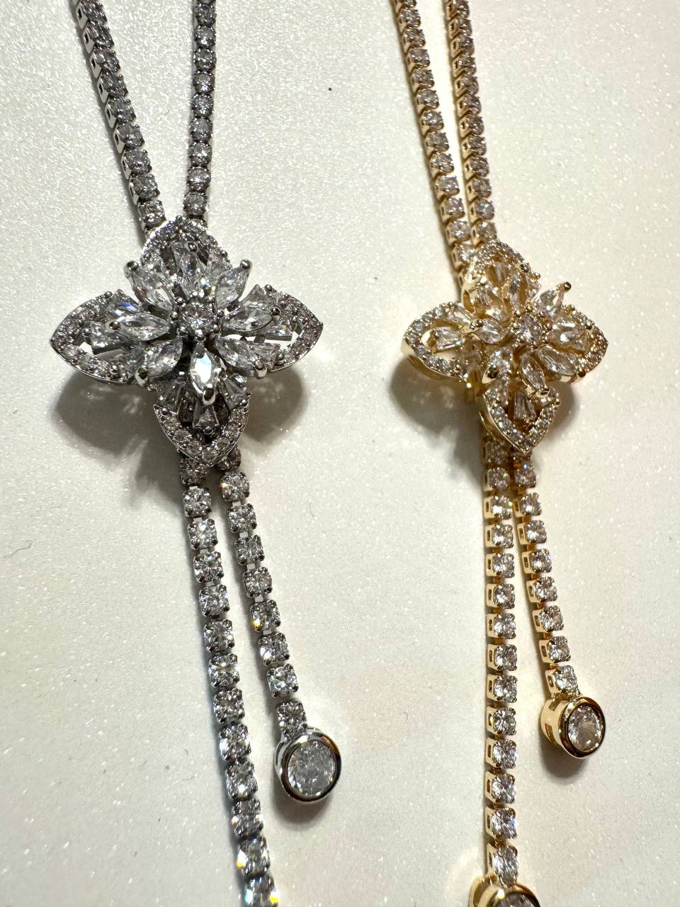 Collane raffinate in ottone dorato e argentato , impreziosite da strass e un particolare fiore luminoso centrale .