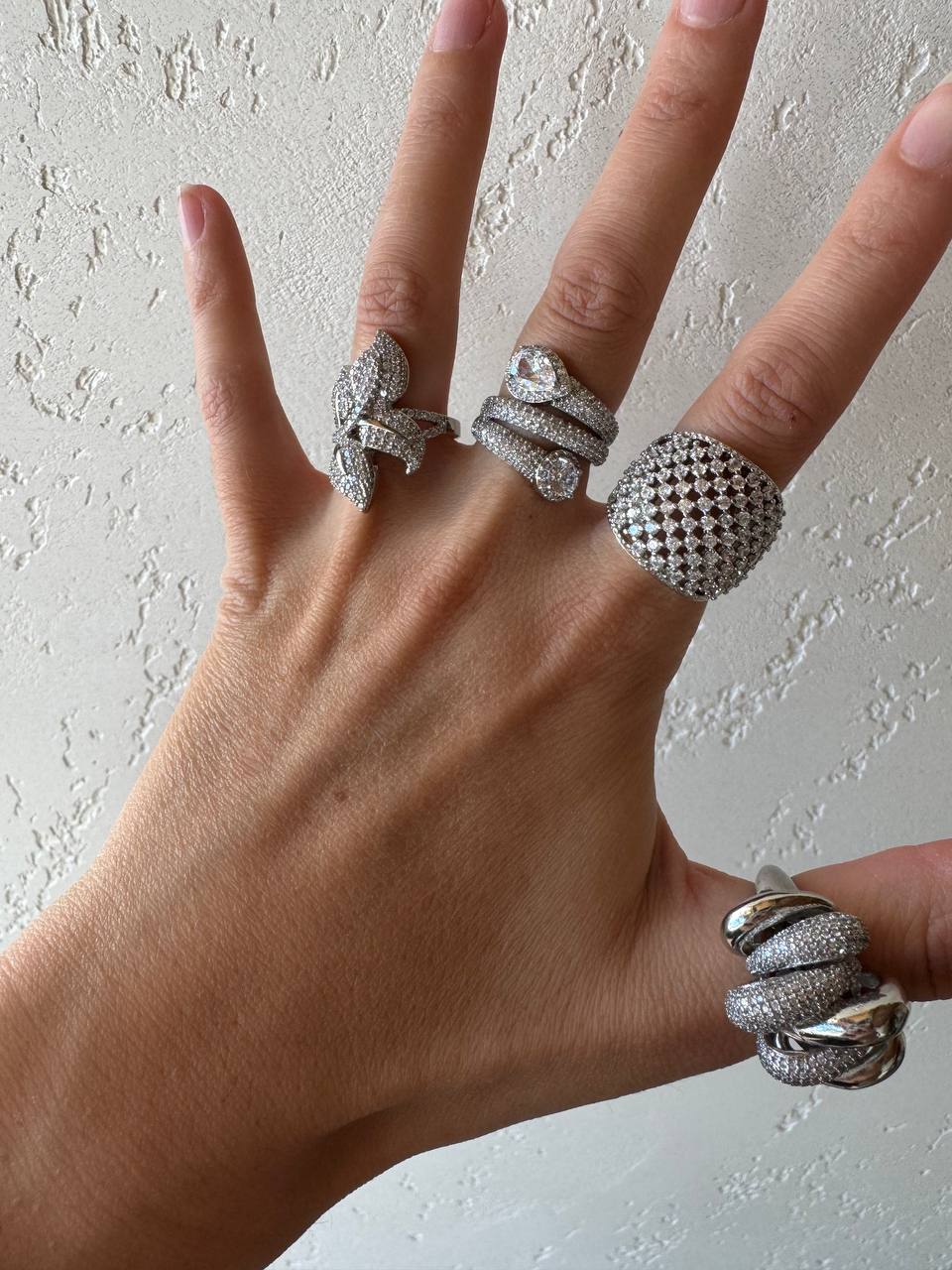 Una linea di anelli in ottone argentato e strass di carattere, di impatto , perfetti per chi vuol farsi notare.