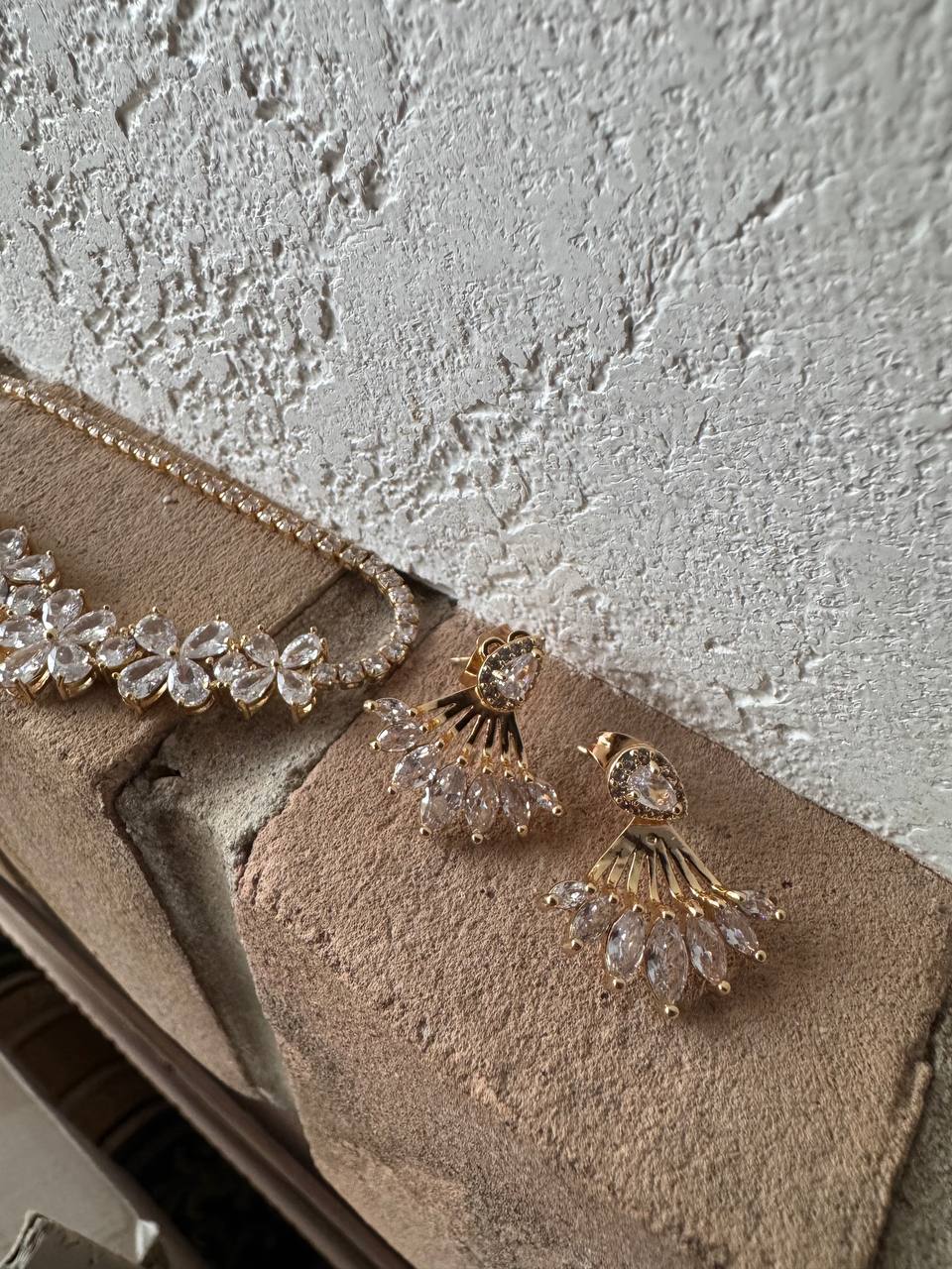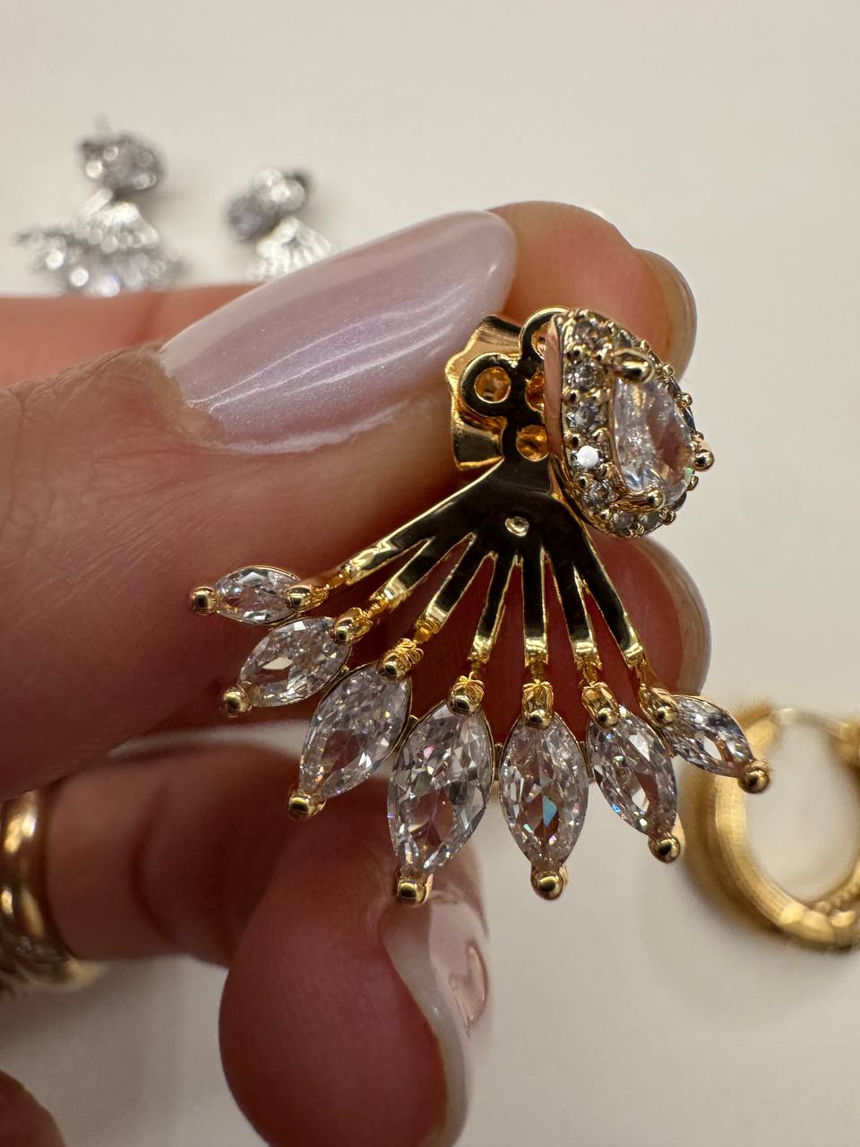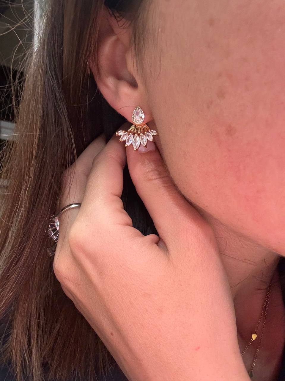 Sono veramente belli e particolari , la goccia rimane nella parte anteriore dell'orecchio e il resto degli strass crea un contorno delicato che rimane nella parte posteriore.
