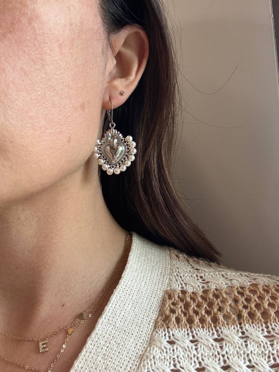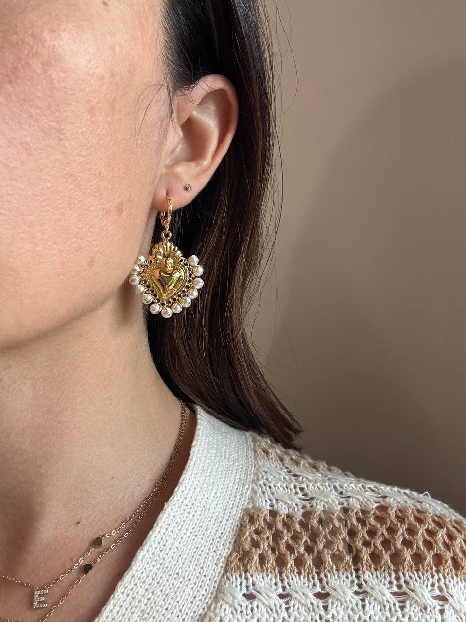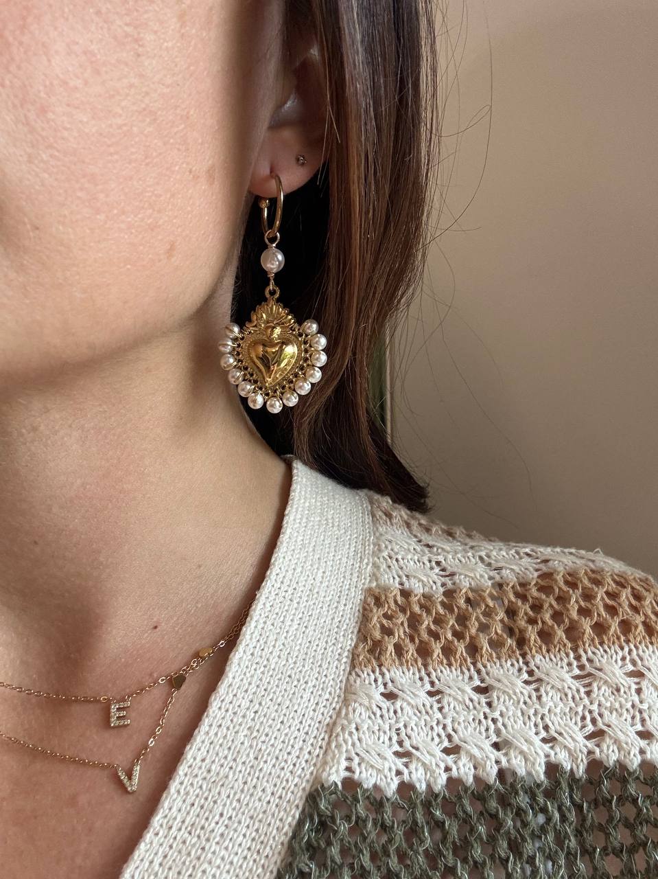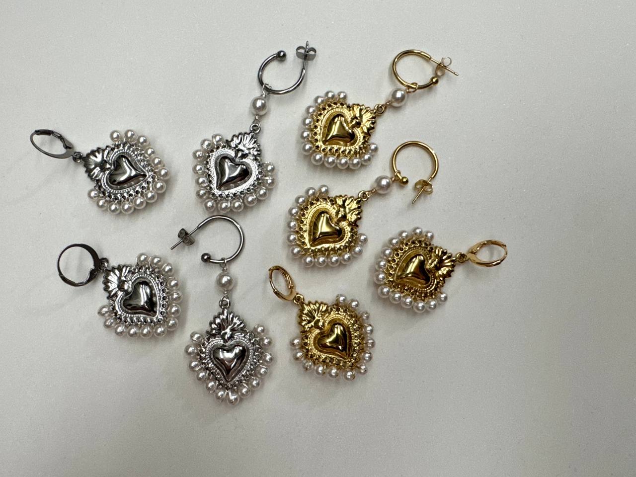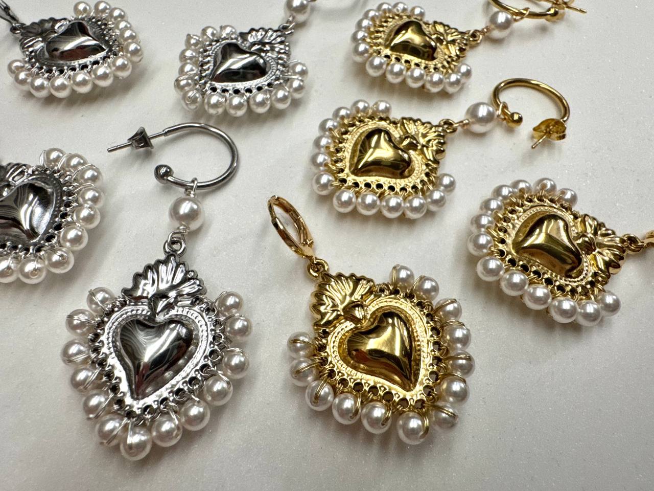 Eleganti orecchini pendenti in acciaio nei colori oro e argento con un raffinato motivo a cuore sacro , circondato da una delicata cornice di perle bianche.
